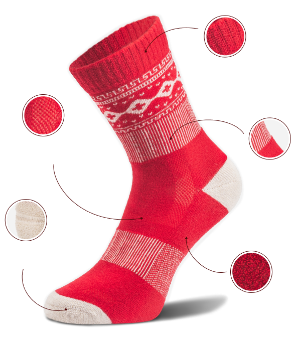 Each sock has a unique decorative band adorned with Nordic patterns circling the ankle.The vibrant shades of fiery red and soft pink turn the print up a notch. They look great in boots, running shoes, and even dress shoes.